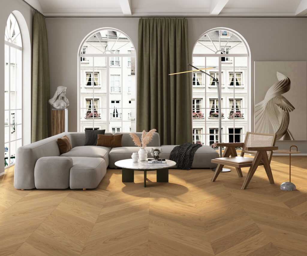 Highlight the elegance of natural wood with the sleek V-lines of the chevron pattern.